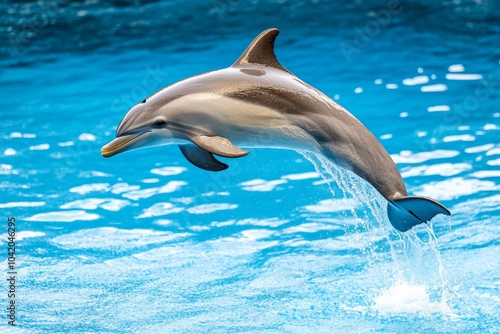 © Natalia, Naklejka premium Playful dolphin leaps beneath bright sunlight creating a sparkling display on the water surface