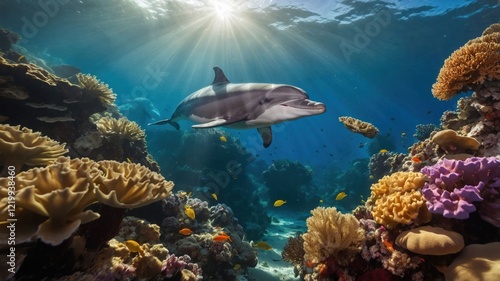 Fototapeta premium Playful dolphin swimming gracefully among vibrant coral reefs in a sunlit underwater scene