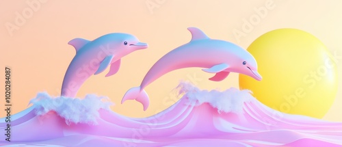 Fototapeta premium Playful dolphins leap joyfully over pink waves as a golden sun sets in a pastel sky, creating a vibrant, whimsical ocean scene.