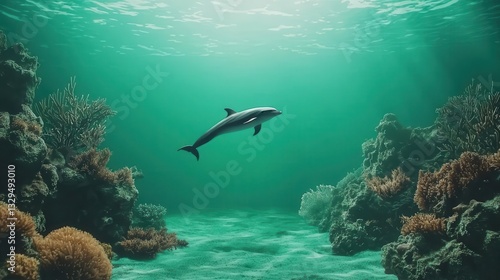 Fototapeta premium Playful dolphins swimming alongside a school of fish, dynamic interaction,...