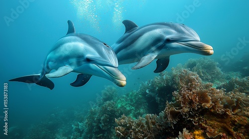 Obraz premium Playful dolphins swimming among vibrant coral reefs underwater