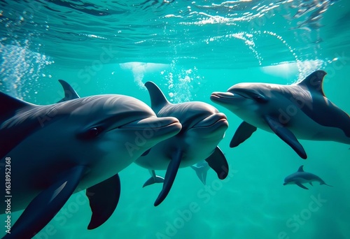 Fototapeta premium Playful dolphins swimming near camera, sunlight filters through water,...