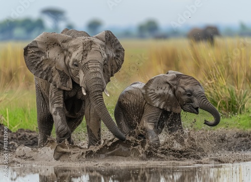Obraz premium Playful Elephant Calves Splashing in Mud