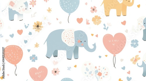 Obraz premium Playful elephants with balloons and flowers whimsical pattern design cheerful...