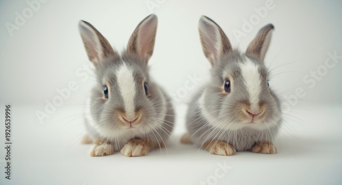 © TheWaterMeloonProjec, Fototapeta premium Playful European baby rabbit showing two distinct poses on white photographic backdrop