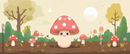 © BOXS, Naklejka premium Playful flat vector art of a kawaii mushroom with polka dots in a minimalist and simple garden setting.