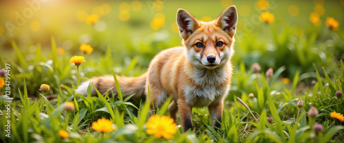© Yury, Naklejka premium Playful fox standing amidst vibrant yellow flowers in a sunlit meadow exuding a sense of curiosity and liveliness