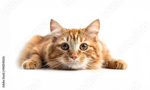 Obraz premium Playful ginger cat lies on a white surface, gazing curiously with bright eyes...