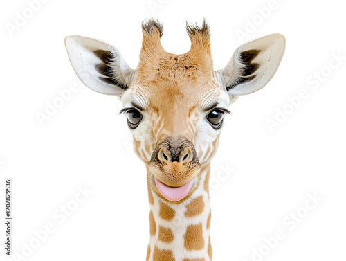 Naklejka premium Playful giraffe portrait, close-up, sticking tongue out, isolated on white background, adorable, funny, wild animal.