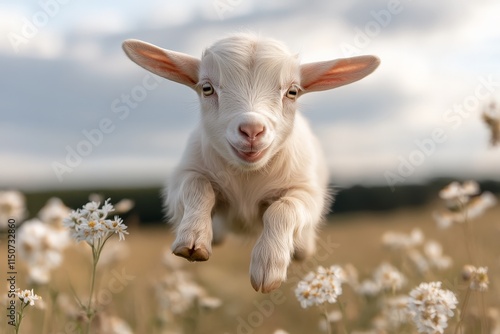 © c80, Obraz premium Playful goat jumping joyfully over flowers in a sunny meadow during spring