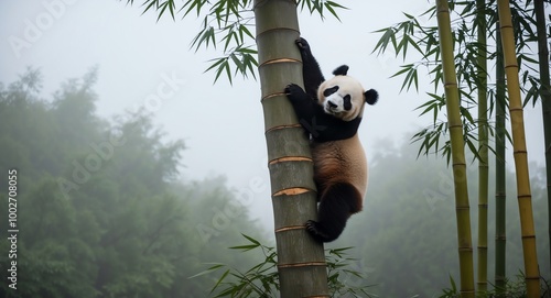 © Arceli, Obraz premium Playful gray panda scaling a tree surrounded by a foggy bamboo grove