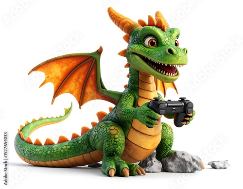 © Sabein, Obraz premium Playful Green Cartoon Dragon Enjoying Video Game