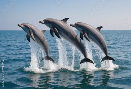 Fototapeta premium Playful group of dolphins leaping out of the ocean.