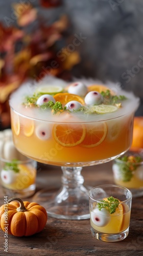 Fototapeta premium Playful Halloween Punch Bowl with Floating Lychee Eyeballs & Citrus Fog