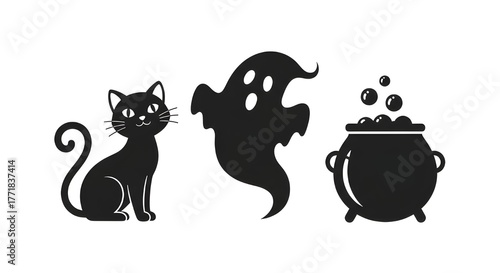 Obraz premium Playful Halloween Silhouette Set — Cat, Ghost, and Cauldron in Cute Minimal Flat Style