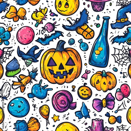 Fototapeta premium Playful Halloweenthemed seamless pattern filled with black outline doodles...