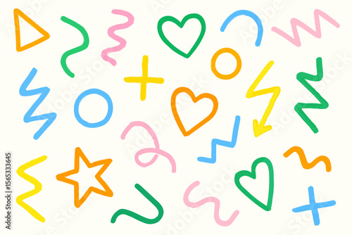 Fototapeta premium Playful Hand Drawn Shapes Pattern in Bright Colors Fun Doodle Design with Hearts Stars Lightning Bolts Circles Zig Zags and Plus Signs