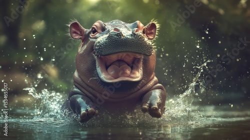 Fototapeta premium Playful hippopotamus emerging from water, splashing.