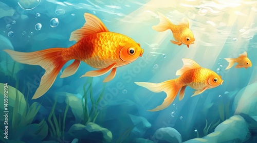Naklejka premium Playful illustration of goldfish swimming gracefully in a vibrant underwater aquatic scene