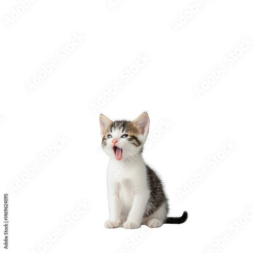 © Natnicha, Fototapeta premium Playful kitten with a playful expression, sitting against a white isolated background, showcasing its adorable features and playful nature.