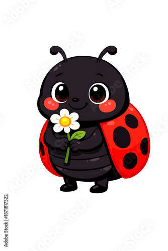 © Urmi, Fototapeta premium "Playful lady beetle character—smiling bug with flower, cute cartoon concept for kids’ artwork."
