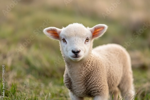 © Viktoriia, Obraz premium Playful lamb stands in green pasture, showcasing soft wool and c