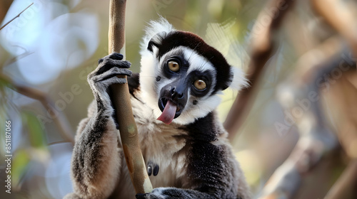 Fototapeta premium Playful Lemur Sticking Out Tongue While Climbing a Tree in Natural Habitat