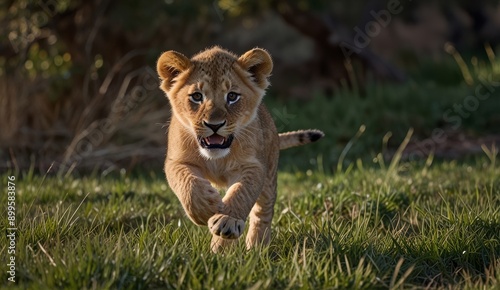 © Василь Тігай, Fototapeta premium Playful Lion Cub Running in Nature
