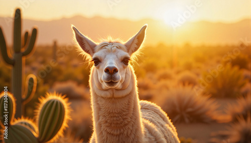 © Ekaterina, Obraz premium Playful llama peeking from behind cactus in golden hour desert, joy