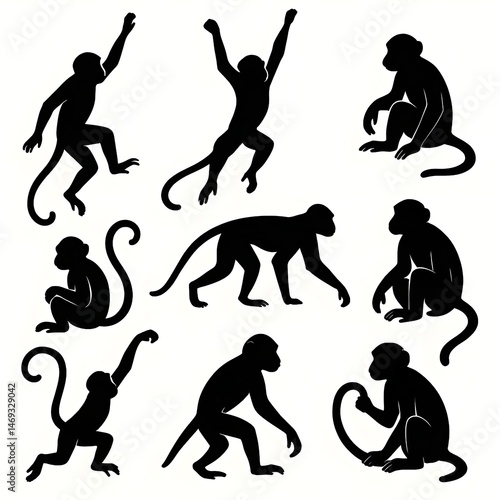 Obraz premium Playful Monkey Silhouettes in Jungle, Vector Climbing, Swinging, Sitting, Tail Holding - Black on White Background