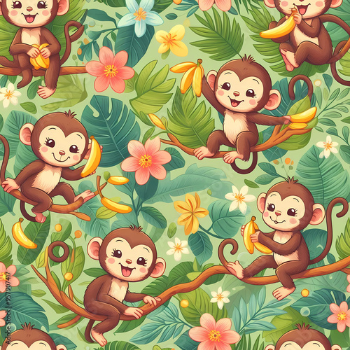 Naklejka premium Playful Monkeys in a Lush Jungle: Seamless Pattern Design for Prints Featuring Adorable Monkeys, Tropical Leaves, and Vibrant Flowers, Perfect for Fabrics, Stationery, and Home Decor
