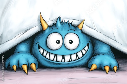© Biggy, Fototapeta premium Playful monster under blanket, bedroom, peeking, illustration, children's book