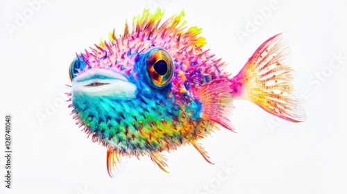 © savittree, Obraz premium Playful neon-themed pufferfish in bold colors, set against a white background.