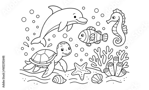 Fototapeta premium Playful ocean animals line art coloring page for kids