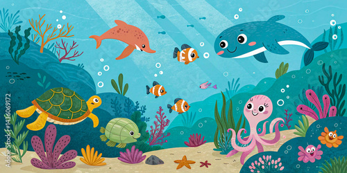 Naklejka premium Playful Ocean Scene with Coral, Fish, and Marine Animals