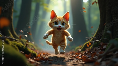 © babangpedia, Fototapeta premium Playful orange tabby kitten happily exploring a sunlit forest trail amidst autumn leaves and tall trees