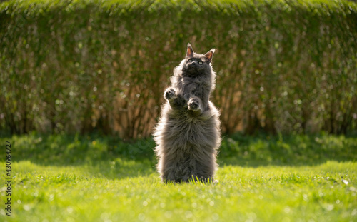 © FurryFritz, Fototapeta premium playful overweight gray maine coon cat rearing up standing on hind legs looking up