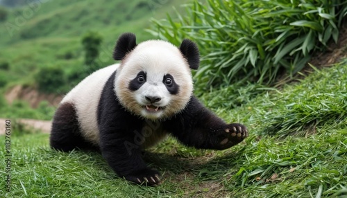 © diditlagi, Obraz premium Playful Panda Cub on a Hillside Meadow
