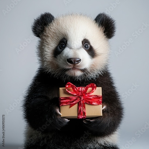 © Nakorn, Naklejka premium Playful panda holding a festively wrapped gift radiating joy and celebration in a whimsical atmosphere