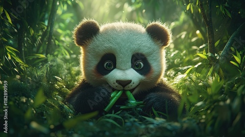 Obraz premium Playful panda munches on bamboo in lush forest under soft sunlight with...
