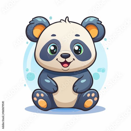 Naklejka premium Playful Panda's Delight: A captivating illustration of a panda bear, radiating innocence and joy, set against a minimalist background of soft blue hues, perfect for conveying themes of charm.