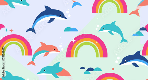 Naklejka premium Playful pattern colorful dolphins, rainbows, simple shapes on light background