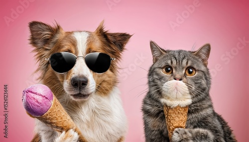 Obraz premium Playful Pets Donning Sunglasses Indulge in Ice Cream Bliss on a Pink...