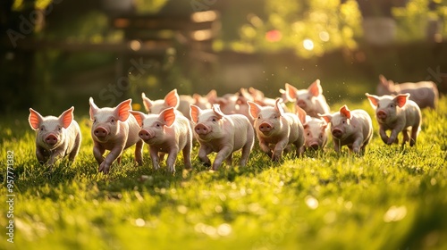 © BerkahStock, Naklejka premium Playful Piglets Running in a Sunny Meadow