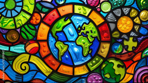 Obraz premium Playful pop art on Earth Day. Stained glass window - Planet fights plastic....