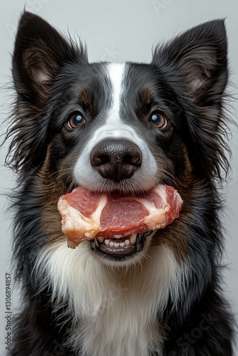 Fototapeta premium 1. Playful portrait of a dog with a meat bone.