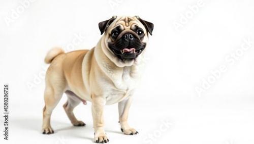 Obraz premium Playful pug, standing, isolated white backdrop, white, brown, pet