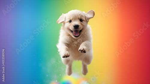 Fototapeta premium Playful puppy leaping against a vibrant rainbow background