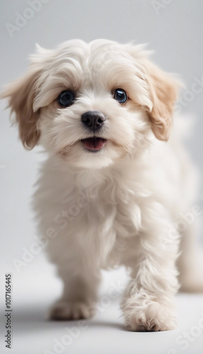 © FrameFinesse, Obraz premium Playful puppy small dog Maltipu runs on a white background vertical