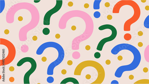 Obraz premium Playful Question Mark Pattern on a Soft Beige Background. A fun and vibrant pattern featuring various question marks and circles in bright, cheerful colors (orange, pink, blue, green).